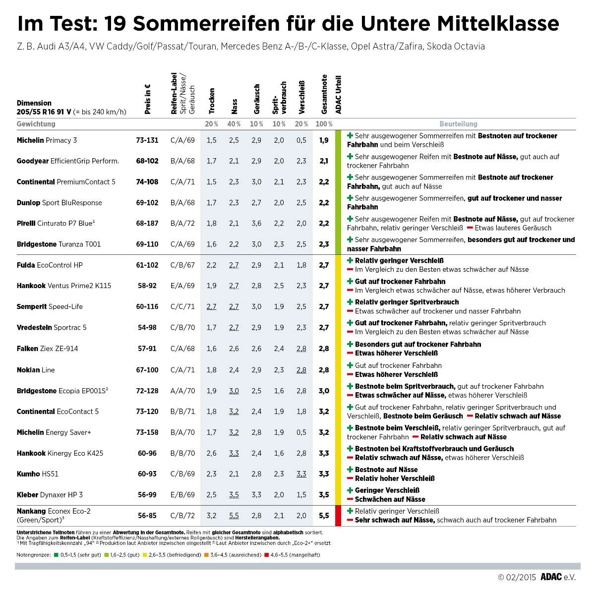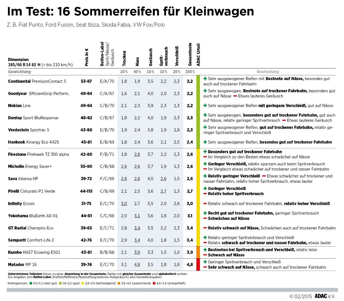 In der Reifendimension für Kleinwagen gab es sechsmal das Urteil „gut“, achtmal „befriedigend“ und je einmal „ausreichend“ (Kumho KH27 Ecowing ES01) und „mangelhaft“ (Matador MP16). „Continental ContiPremiumContact 5“ glänzt mit sehr guten Handlings-Eigenschaften, der „Goodyear Efficient Grip Performance“ mit den kürzesten Bremswegen. Das breite Mittelfeld zeigt leichte bis eindeutige Schwächen auf nasser Fahrbahn. Insgesamt jedoch gilt: Vor allem die mit „gut“ bewerteten Reifen unterscheiden sich nur geringfügig voneinander.