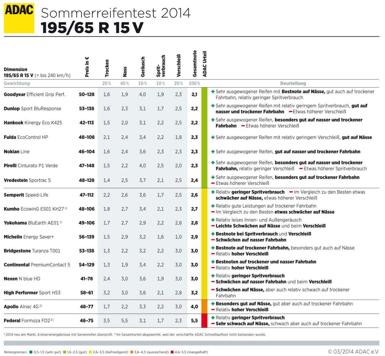 Bei den 195ern überzeugen die Produkte von Goodyear, Dunlop, Hankook, Fulda, Nokian, Pirelli und Vredestein. Sie erhalten eine gute Bewertung. Die Pneus von Semperit, Kumho und Michelin werden aufgrund leichter Schwächen auf nasser Fahrbahn abgewertet und schneiden „befriedigend“ ab. Bei den Reifen von Yokohama, Bridgestone und Continental schlagen Schwächen im Verschleiß durch. Sie erhalten ebenfalls das Urteil „befriedigend“. Interessant beim Conti-Reifen (Modell ContiPremium-Contact 5): Er erzielt in den Kriterien Nassbremsen und Nasshandling ein „sehr gut“, schneidet im Verschleiß aber sehr schlecht ab. Ähnlich beim Bridgestone, einer der fünf Besten auf Nässe. Auch er zeigt Schwächen im Verschleiß. Insgesamt haben in der Dimension 195/65 R15 V von den fünf besten Modellen auf nasser Fahrbahn drei Modelle wegen erhöhtem Verschleiß schlechter abgeschnitten. Der Zielkonflikt „Nassgriff versus Verschleiß“ zeigt sich in dieser Dimension besonders deutlich. Der Nexen N blue HD und der High Performers Sport HS3 schließen aber auch mit „befriedigend“ ab. Das Modell Apollo Alnac 4G konnte den verschärften ADAC-Schnelllauftest nicht bestehen, sodass es nur für das Urteil „ausreichend“ reicht. Der Federal Formoza, ebenfalls mit Problemen im Schnelllauftest, bildet mit einem „mangelhaft“ das Schlusslicht. Grund dafür: Sehr schwache Fahrleistungen auf nasser Fahrbahn.