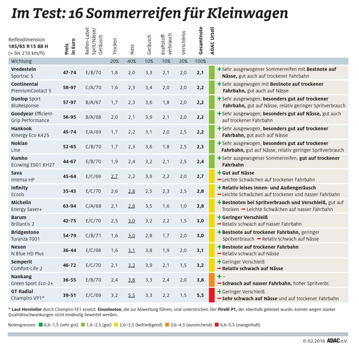 Von den 32 getesteten Sommerreifen im ADAC Sommerreifentest 2016 schnitten elf mit „gut“ ab, 18 mit „befriedigend“, zwei erhielten ein „ausreichend“ und nur einer fiel mit „mangelhaft“ durch. Getestet wurde in den Dimensionen 185/65 R15 für Kleinwagen sowie 225/45 R17 für die Mittelklasse bzw. untere Mittelklasse.