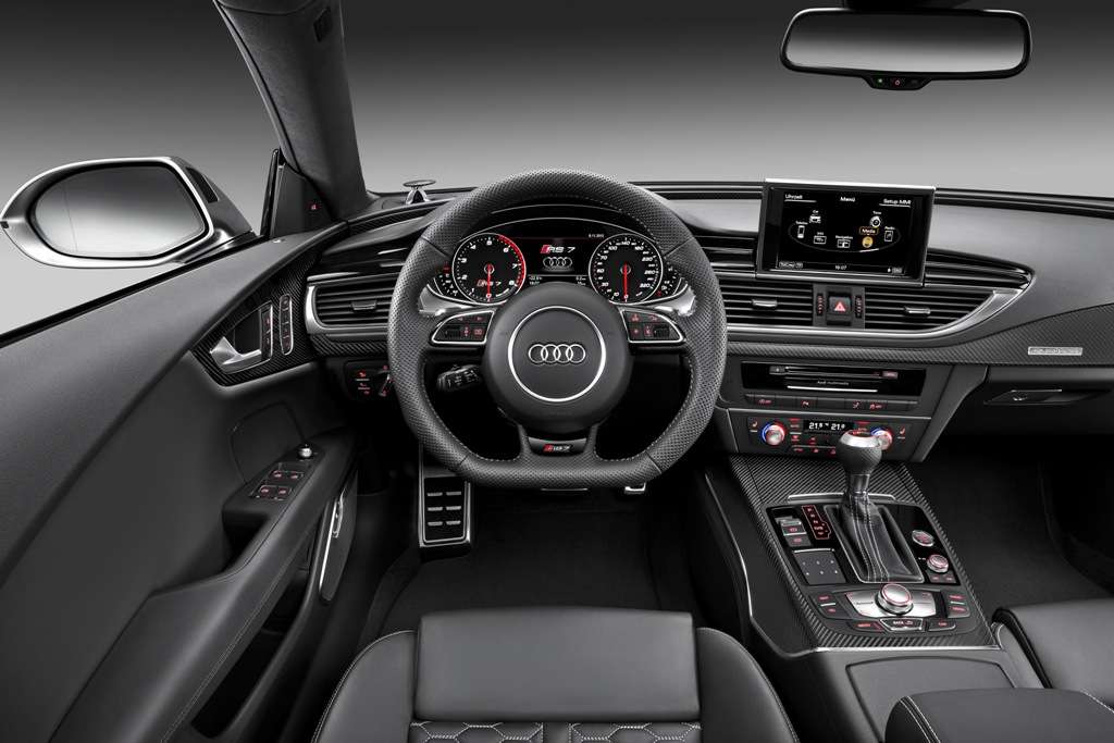 Im Cockpit des Audi RS 7 Sportback setzt sich die elegante Dynamik fort. Die Rund­instrumente haben schwarze Zifferblätter, weiße Skalen und rote Zeiger; ein plastischer RS 7-Schrifzug im Drehzahlmesser setzt einen weiteren Akzent. Der Schlüssel, das abgeflachte Dreispeichen-Lederlenkrad, die beleuchteten Einstiegs­leisten und die Anzeigen für das MMI und das Fahrerinformations­system (FIS) tragen ebenfalls RS-Badges. Im FIS weist ein Schaltblitz auf das Erreichen der Drehzahlgrenze hin; Anzeigen für Ladedruck und Öltemperatur sowie ein Laptimer runden das RS 7-spezifische Menü ab.
