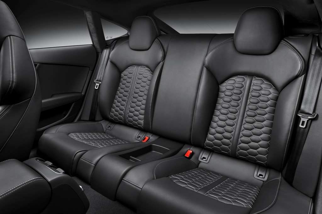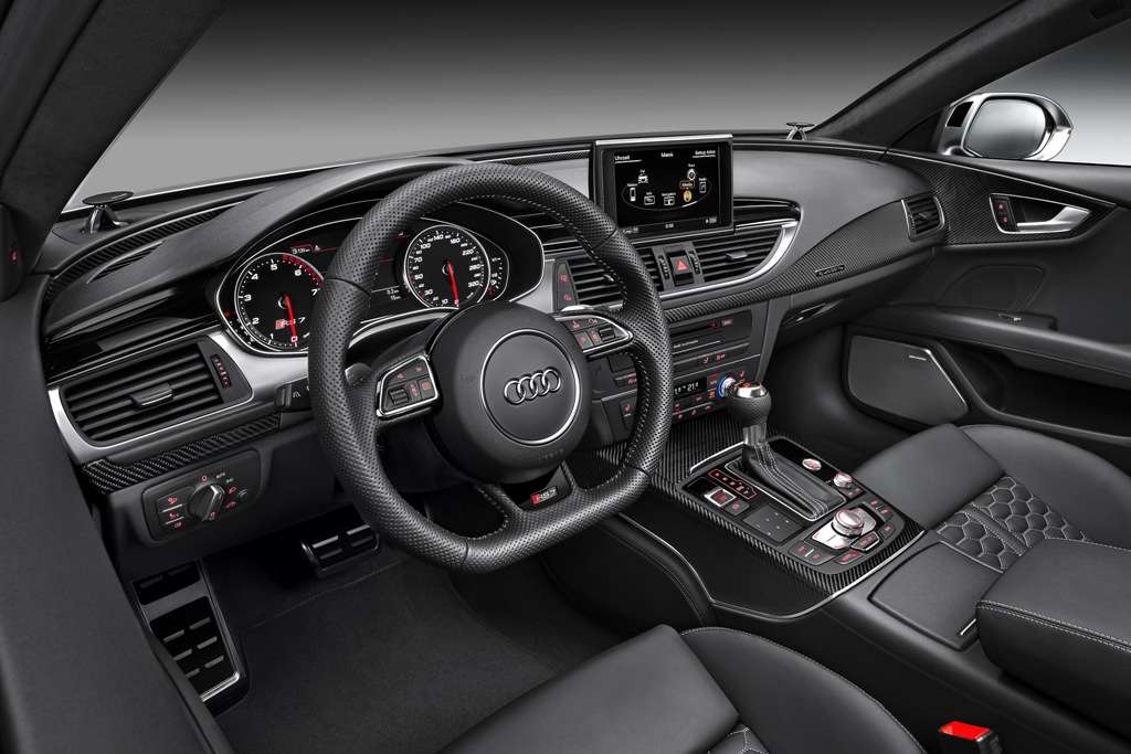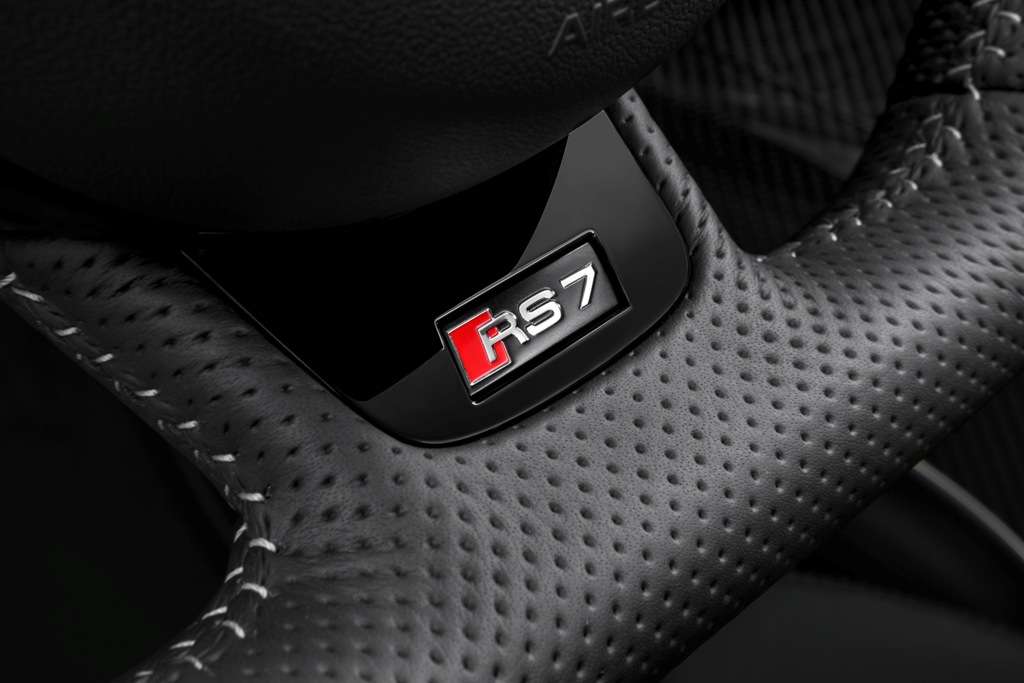 RS-Sportsitze mit ausgeprägten Seitenwangen, integrierten Kopfstützen und RS 7-Schriftzügen sind Serie; ihre Bezüge sind in einer schwarzen Alcantara/Leder-Kombination gehalten, die Mittelbahnen ziert eine Rautensteppung.