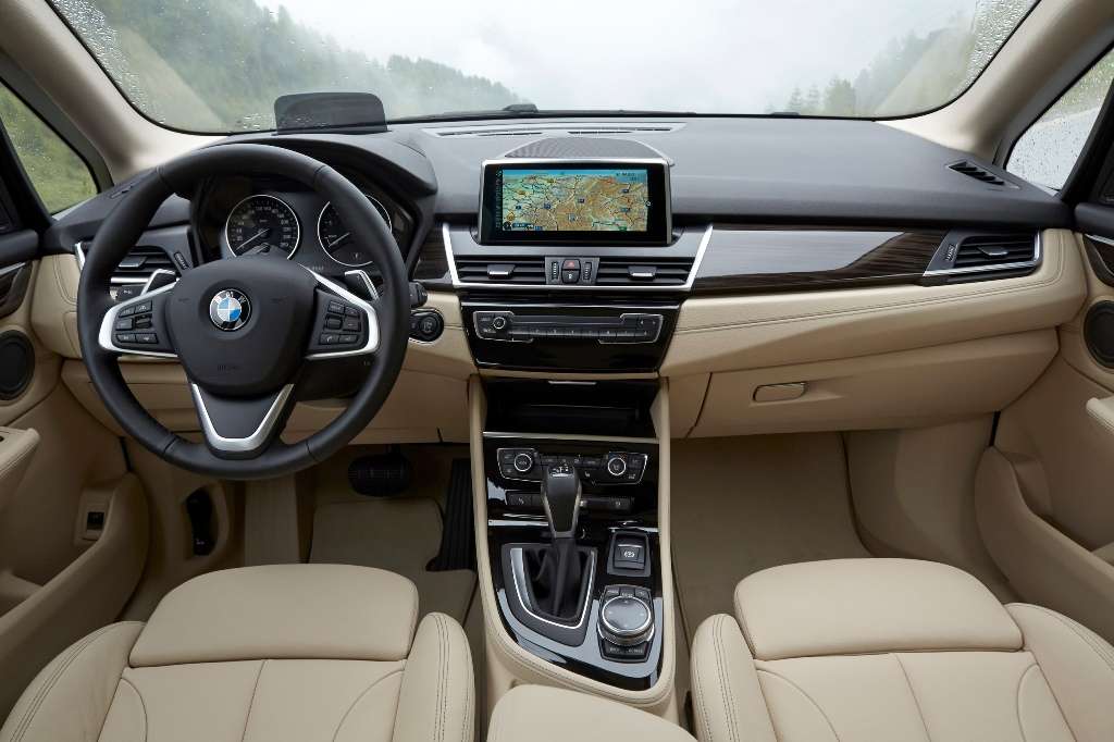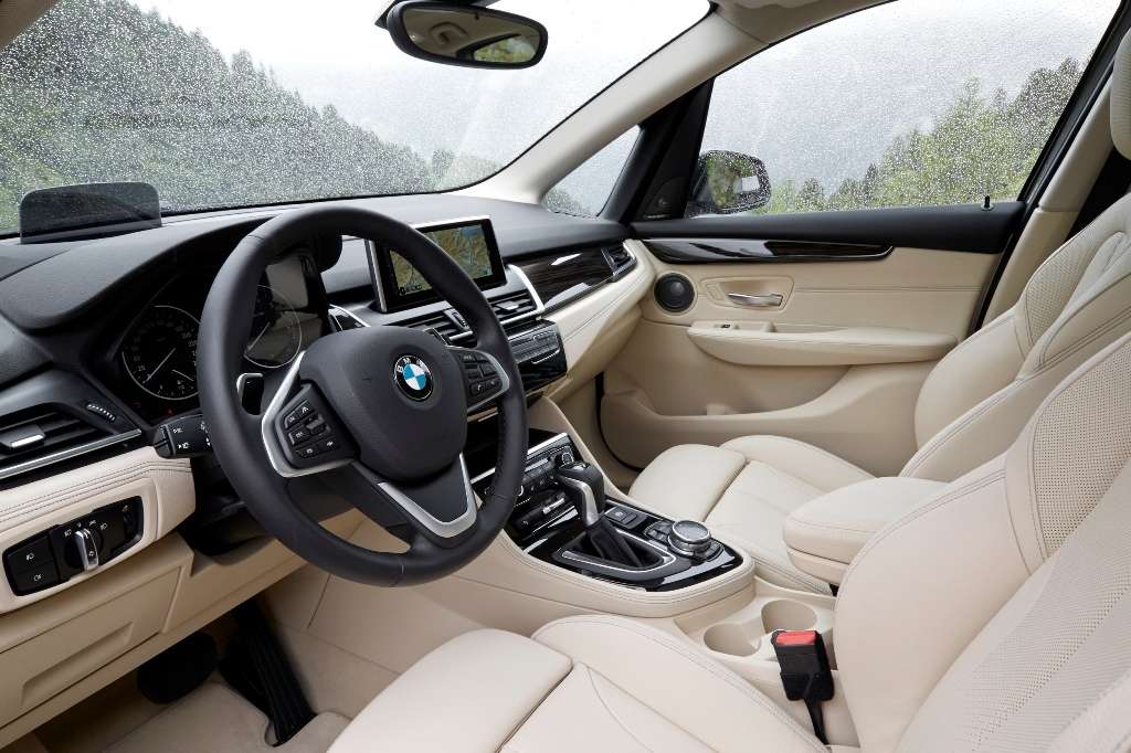 Die sieht man wegen der schwarzen Folie an der Windschutzscheiben-Unterkante innen allerdings nicht. Im Innenraum springt das Armaturenbrett nach Art des Hauses ins Auge: kleines, dickes Lederlenkrad, in allen Ausstattungsvarianten sportlich aussehende Sitze klassische Rundinstrumente, ein aufgesetzter Bildschirm fürs Infotainment-System und die gewohnten, gut angeordneten Bedienelemente. Zum ersten Mal in dieser Klasse bietet BMW beim Active Tourer ein Head-up-Display an. Das projiziert die Daten in Farbe auf eine kleine Scheibe vor der Windschutzscheibe. Allerdings kann man das Display nur zusammen mit der großen „Navigation plus“ für insgesamt 2490 zusätzliche Euro bestellen.