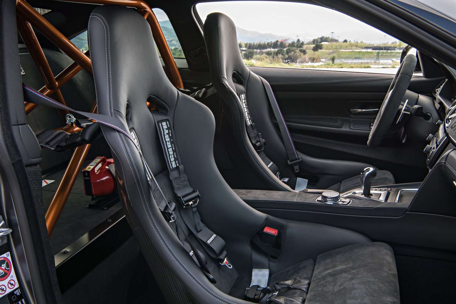 Der Fahrerplatz hebt sich deutlich vom regulären M4 ab: Die Rennsitze mit Kohlefaser-Rahmen umschließen Fahrer und Beifahrer perfekt, und beim kostenlos verfügbaren Clubsport-Paket gibt es obendrein einen Sechspunkt-Gurt, einen Feuerlöscher und einen Überrollkäfig. Die frugale Türverkleidung nutzt die gleichen Materialien wie das leichte Öko-Auto i3, statt eines Zuziehgriffs gibt es eine Textilschlaufe, und die Armaturentafel ist mit einem Alcantara-Streifen dekoriert.