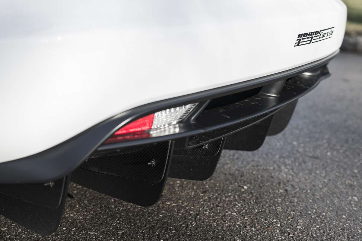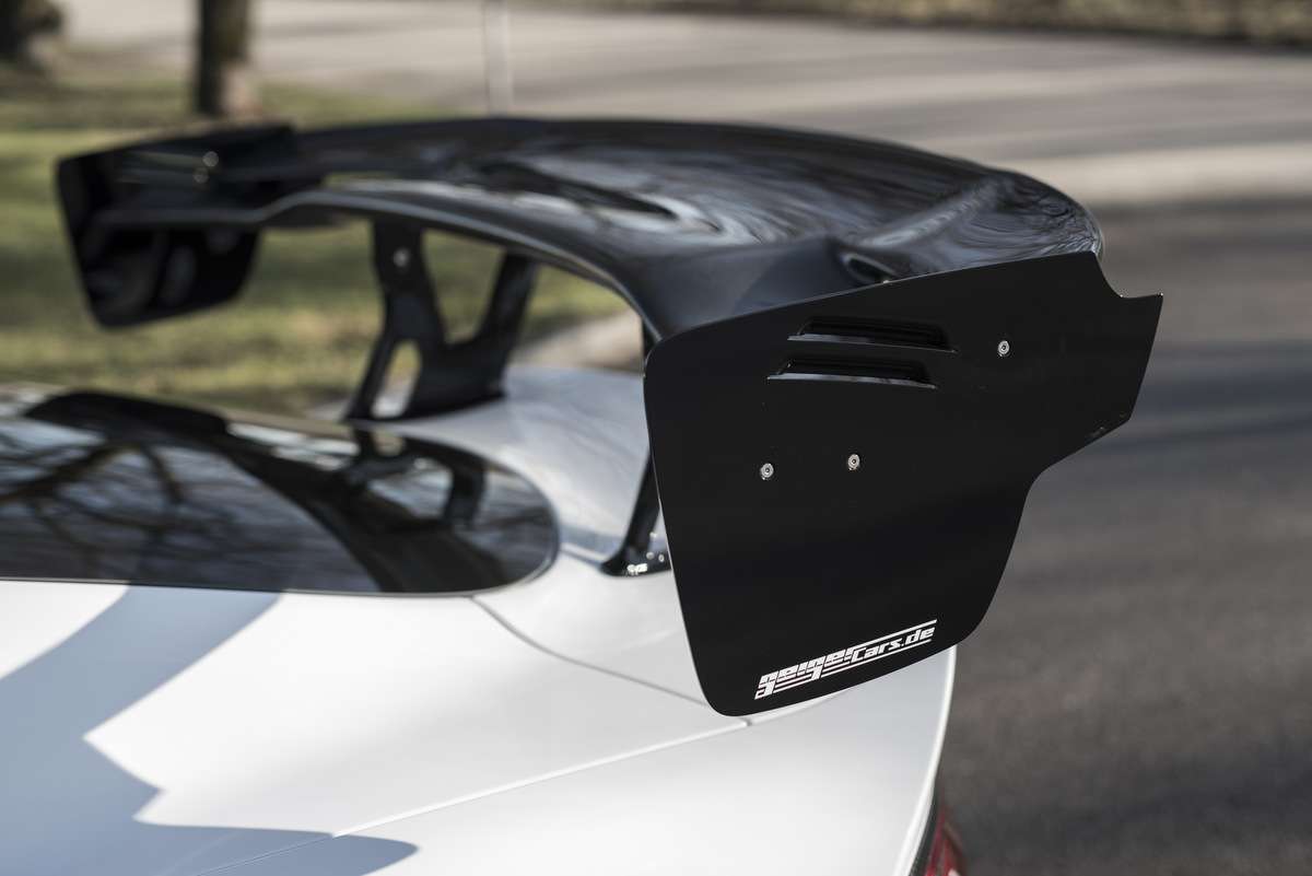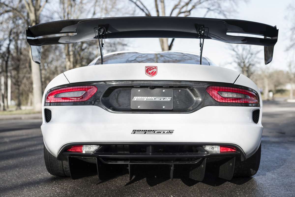 Bei GeigerCars.de in München ist der American Club Racer mit dem brutalen „Extreme Aero Package“ erhältlich: Am mächtigen Nüstern trägt die Viper ACR mit diesem einen üppig dimensionierten Frontsplitter, die den Fahrwind über das Auto „hebt“, anstatt ihn darunter rutschen zu lassen. An der Frontschürze installierte Doppel-Flaps leiten den Luftstrom nach achtern, wo ihn ein 1,88 Meter breites und einstellbares Heckleitwerk mit Gurney Flap und seitlichen Luftleitelementen in Downforce und Spurstabilität ummünzt. Eine Etage tiefer findet sich darüber ein Carbon-Heckdiffusor mit sechs großen Finnen, der die Fahrstabilität bei hohen Geschwindigkeiten weiter optimiert. Luftauslassöffnungen befinden sich sowohl in der markanten Motorhaube als auch auf den vorderen Kotflügeln. Das Ergebnis dieser Flügel-Bewehrung ist beeindruckend: Bei Höchstgeschwindigkeit presst der Fahrwind die Viper ACR mit beinahe einer Tonne Abtrieb auf den Asphalt.