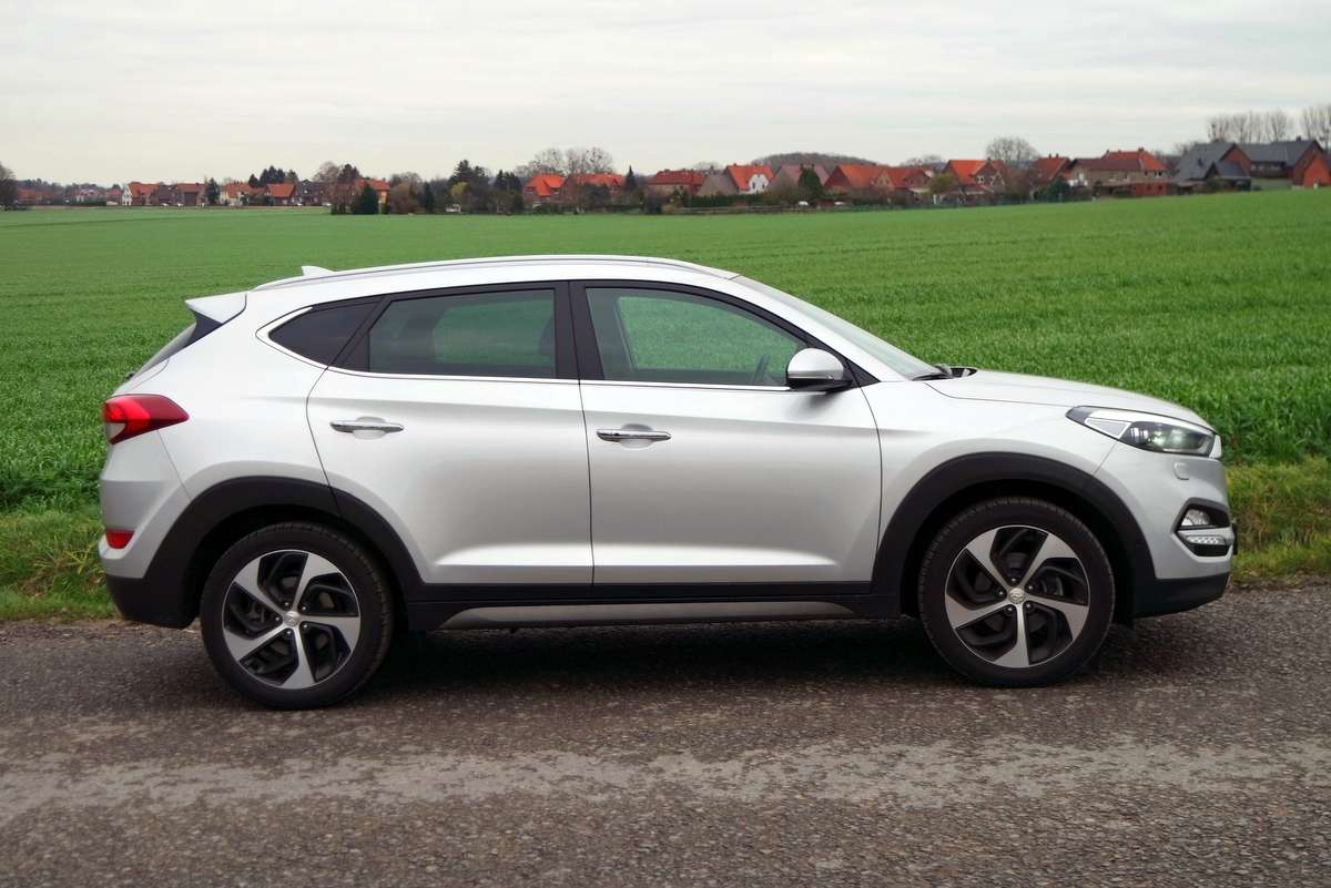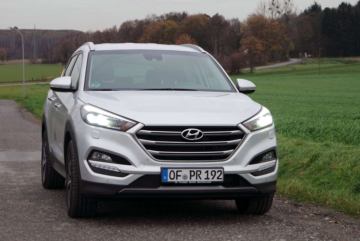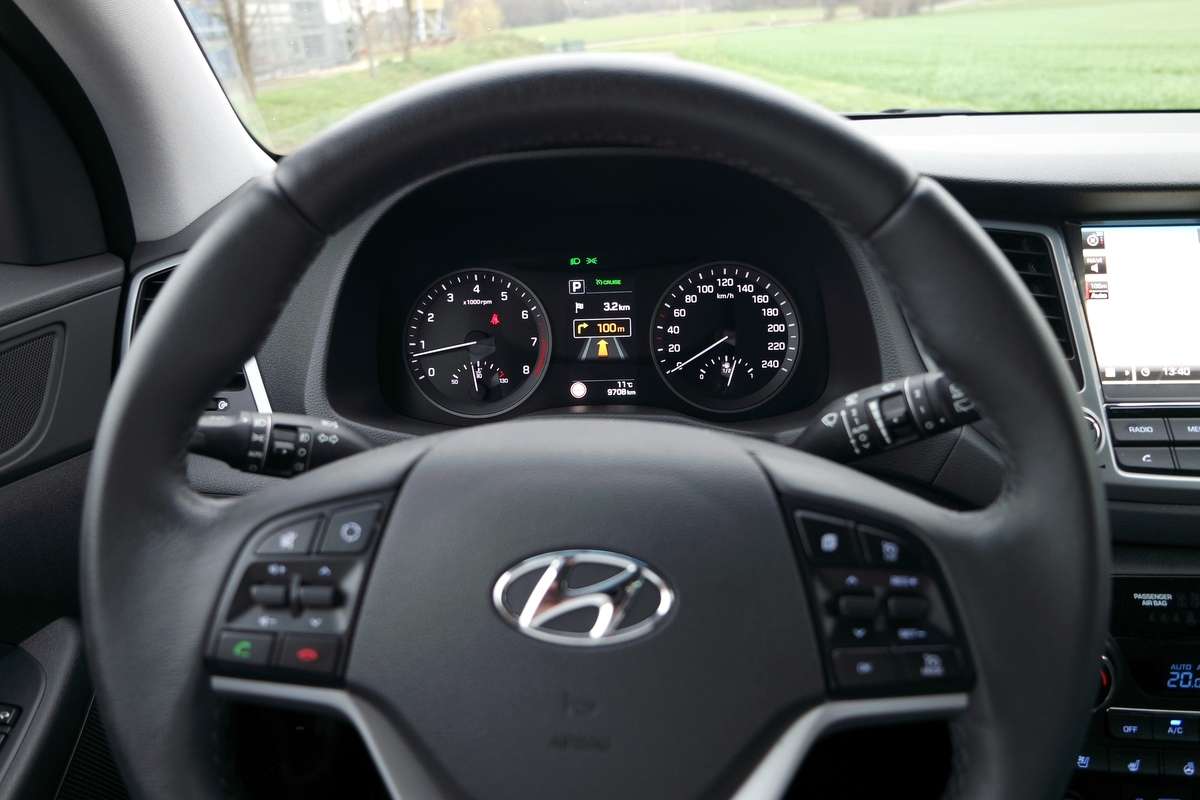 Zunächst einmal die Feststellung: Beim Preisniveau hat sich nichts geändert. Wir fuhren den Hyundai Tucson mit dem stärkeren der beiden 1,6-Liter-Turbobenziner mit 130 kW / 177 P, Sieben-Gang-Doppelkupplungsgetriebe und Allradantrieb in der besten Ausstattungsstufen „Premium“ zum Basispreis von 34.450 Euro. In der einfachen „Classic“-Version mit Vorderradantrieb und 132 PS kostet der Tucson ab 22.400 Euro in der teuersten mit dem 185-PS-Diesel in Premium 37.900 Euro. Damit liegt der Tucson am unteren Ende der Preisskala seiner importierten Wettbewerber und hält deutlich mehr als 10.000 Euro Abstand zum Premium-Bereich.