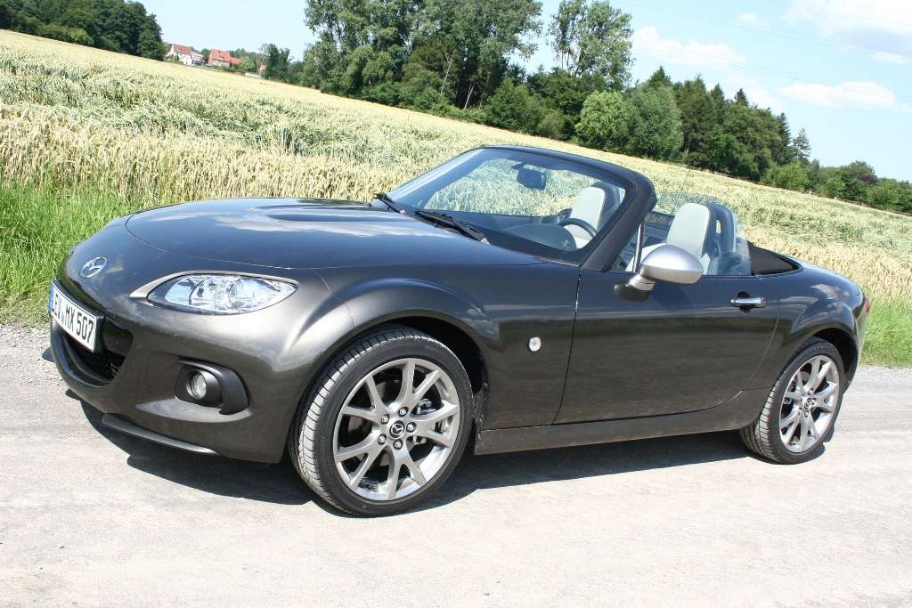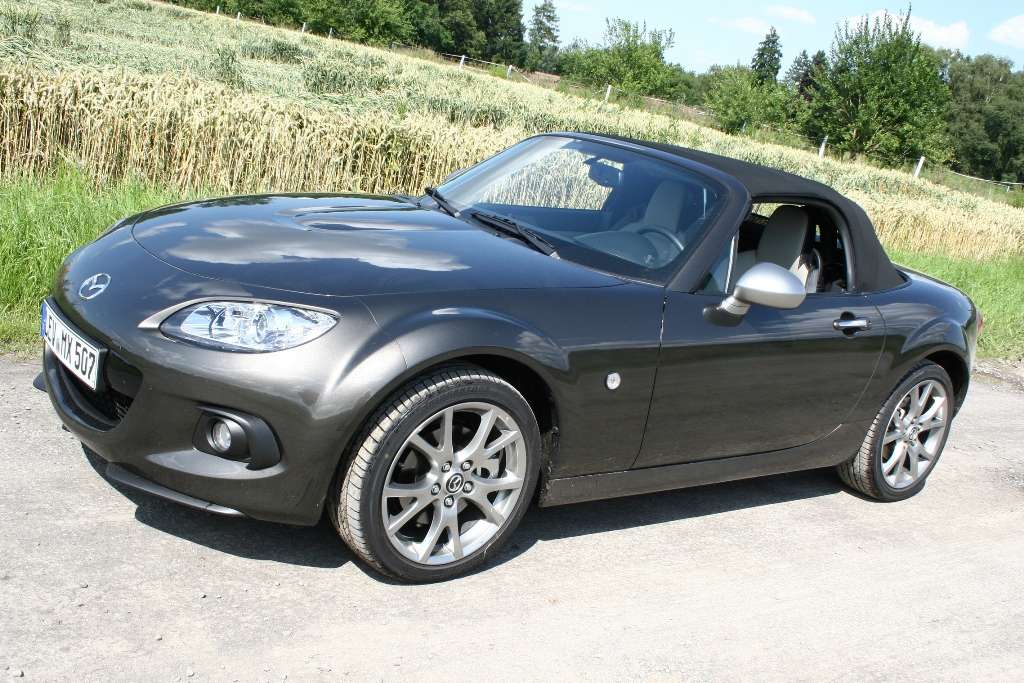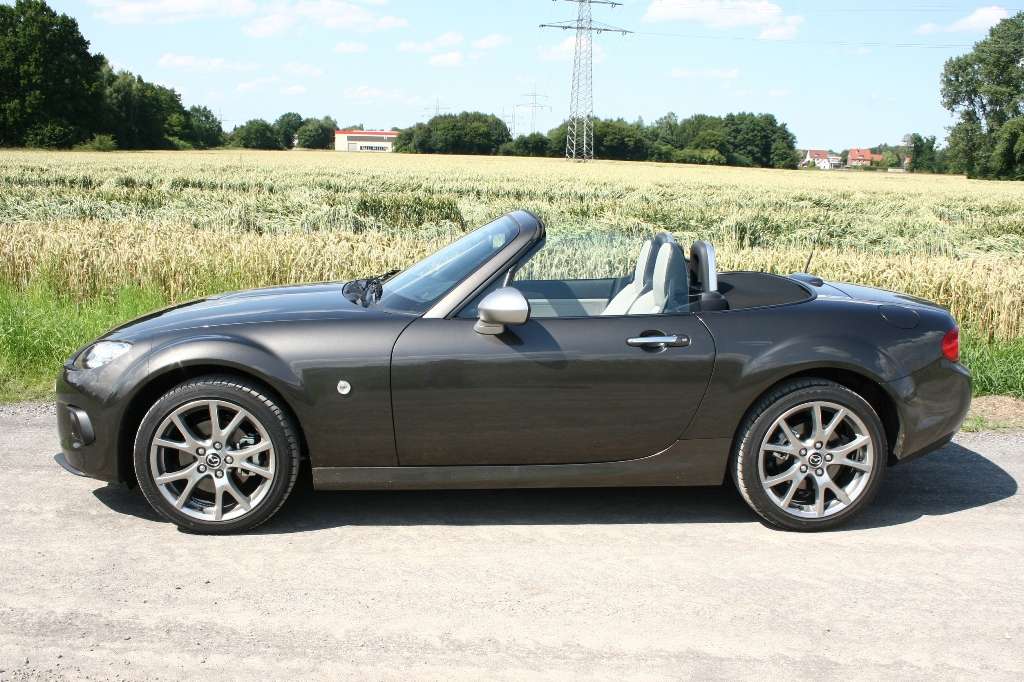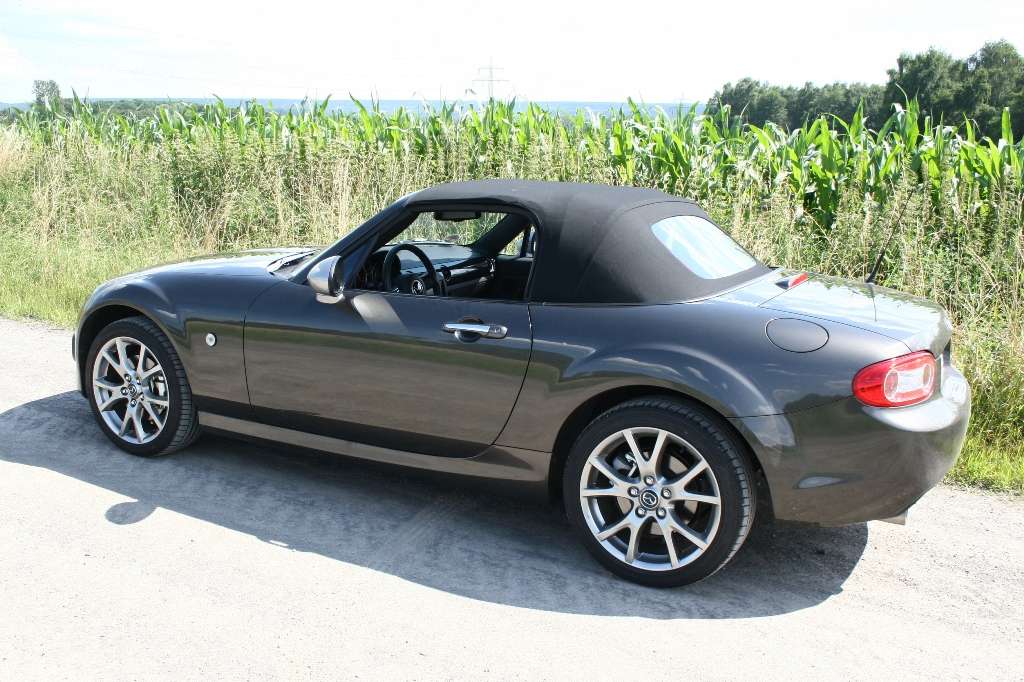 Die letzte Begegnung liegt schon ein paar Jahre zurück, aber die Erinnerung trügt nicht: Der Mazda MX-5 bietet auch mit kleineren Motoren puren Fahrspaß. Vermuteten wir nach den ersten paar hundert Metern zunächst den 2,0-Liter-Antrieb mit 118 kW / 160 PS unter der langen Haube, war es tatsächlich das 34 PS schwächere 1,8-Liter-Aggregat. 93 kW / 126 PS in einem Sportwagen? Das klingt wenig sexy in Zeiten, in denen selbst mancher Kleinwagen schon 100 PS mitbringt, kann aber im meistverkauften Roadster der Welt überzeugen. Seit einem Vierteljahrhundert und drei Modellgenerationen erinnert der japanische Zweisitzer nun schon daran, das Fahrspaß nichts mit PS-Protzerei zu tun haben muss und an den Untergang der einst ruhmreichen britische Tradition bezahlbarer Roadster.