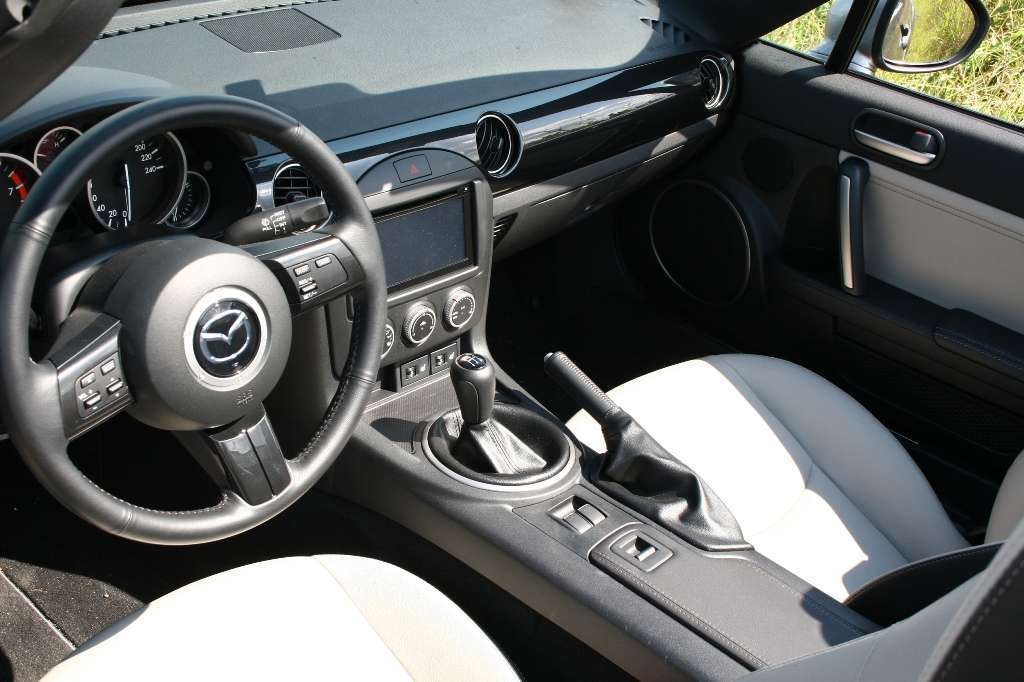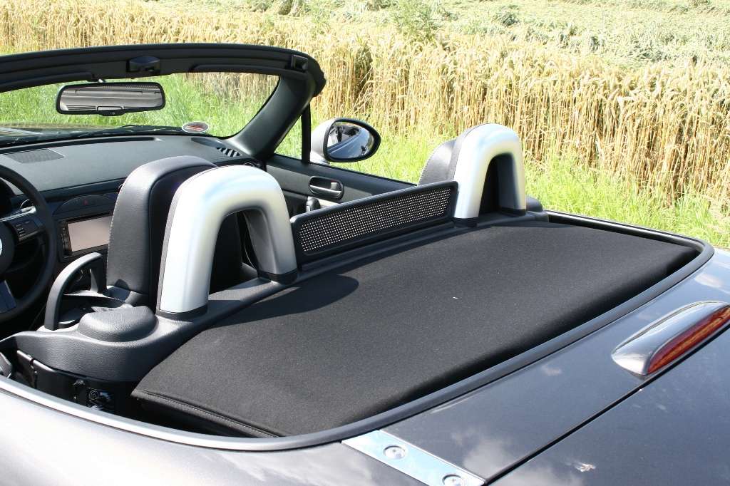 Bei geschlossenen Scheiben und aufgeklapptem, fest montierten Windschott bekommt man kaum Wind ab, der allenfalls etwas über die Haare streicht. Der MX-5, der unter dem Namenszusatz Roadster Coupé auch mit Stahlklappdach lieferbar ist, hat als Roadster ein klassisches Stoffverdeck. Ebenso klassisch ist dessen Bedienung: Statt Elektrohilfe ist Handarbeit angesagt. Das ist kein Nachteil, denn schneller geht’s wirklich nicht. Am oberen Windschutzscheibenrahmen müssen lediglich zwei kräftige Metallklammern gelöst werden und schon lässt sich mit etwas Schwung das Verdeck mühelos nach hinten in das dafür vorgesehene Fach werfen. Nur das Verriegeln beim Schließen des Faltdaches fühlt sich immer ein wenig brutal an, da der Haken, der das Gestell eng an den Fensterrahmen zieht, sehr unter Spannung steht (stehen muss). In geschlossenem Zustand bleibt hinter den Sitzen an Stelle des zusammengefalteten Verdecks eine kleine Hutablage.