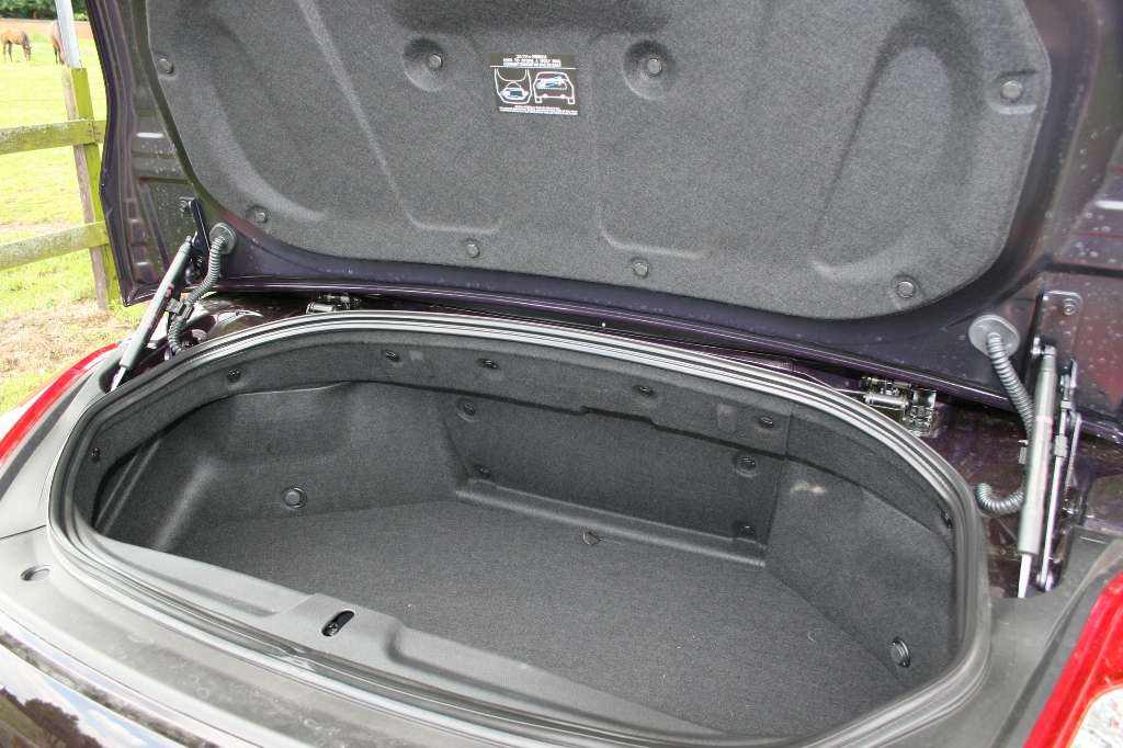 Da das Stoffdach in einem separaten Fach hinter den kühlbaren Sitzen und vor dem Kofferraum verschwindet, bleibt nur sehr wenig Raum für Gepäck. Nissan versäumt es aber nicht, im Kofferraumdeckel einen Hinweis anzubringen, wie am geschicktesten ein Golfbag im 140 Liter kleinen Laderaum verschwindet.
