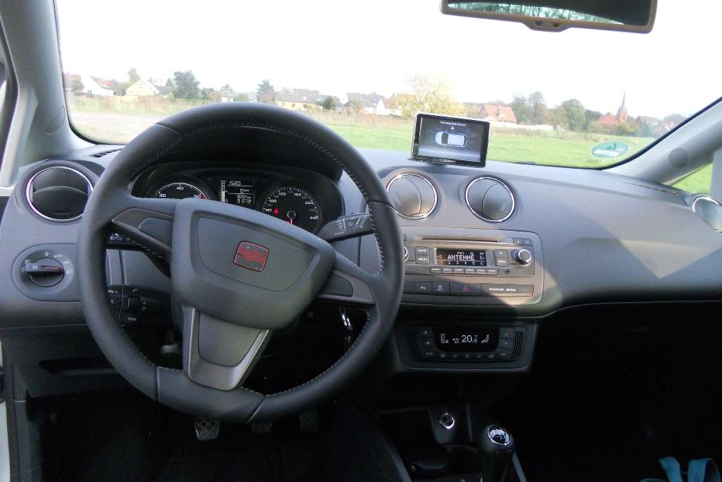 Im Innenraum treffen die Passagiere auf angenehm gespannte, runde Formen, sportliches Ambiente und gute Verarbeitung der verwendeten Materialien. Die Sitze sind gut ausgeformt und bieten so auch guten Seitenhalt. Die Größe der Sitze orientiert sich allerdings eher an der Körpergröße von kleinen Südländern. Sie hätten für Mitteleuropäer gern etwas größer ausfallen dürfen. Auch die Kopfstützen sollten weiter ausziehbar sein. Im Fond verfügt der Ibiza ST trotz des Kombi-Formates nur über knappen Knieraum und wegen des abfallenden Dachs nur über wenig Kopfraum. Der Seat Ibiza ist eben als Fahrzeug für die junge Familie konzipiert, bei der die Kinder die Rückbank bevölkern-