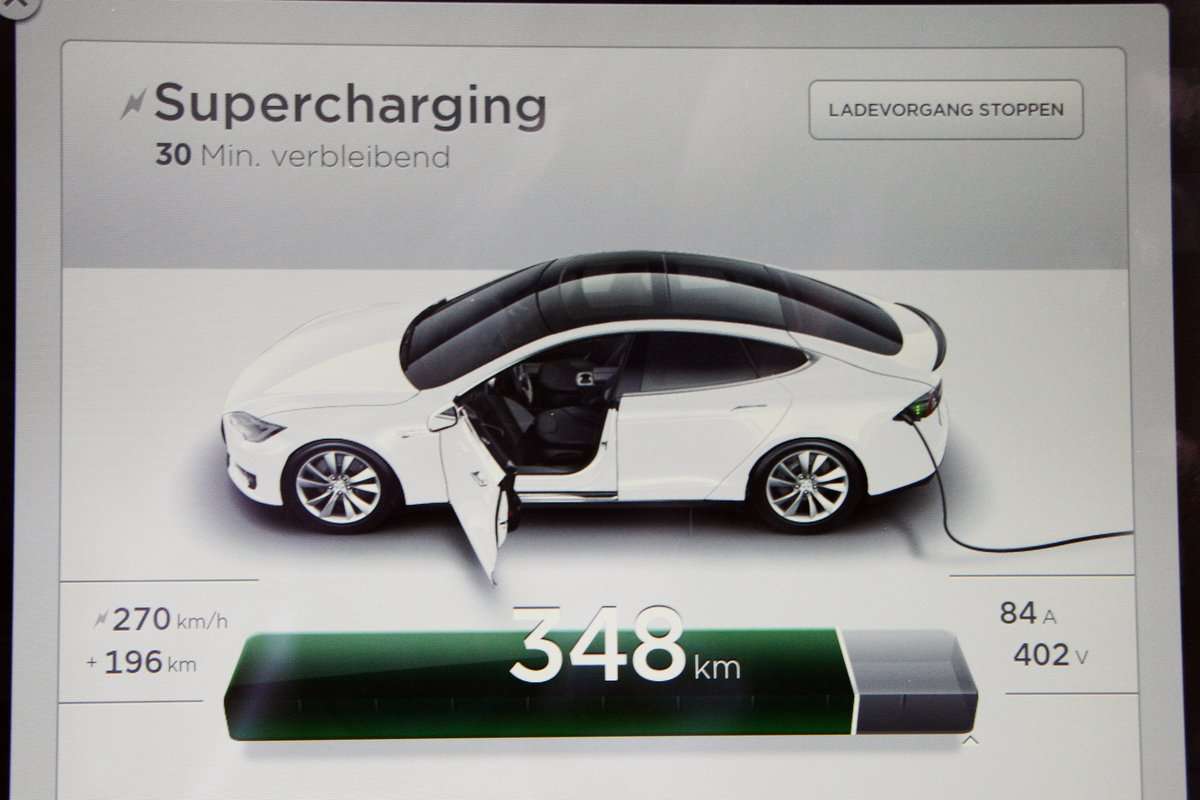 Zur Wahrheit gehört natürlich auch, dass allzu häufiges Ausleben des Beschleunigungs-Wahnsinns die Reichweite enorm reduziert, ein Stromverbrauch von 600 Wattstunden (Wh) je Kilometer ist keine Seltenheit. Die Anpassung an allgemeine Verkehrs-Gepflogenheiten erlaubt jedoch einen Verbrauch von etwa 180 bis 220 Wh pro Kilometer. Der Monitor hilft dabei, den Spaß nicht zu übertreiben. Ein großes Kurvendiagramm zeigt in Echtzeit an, was aus den Zellen gesaugt wird. Bei diesem Test waren es im Schnitt 24 kWh je 100 Kilometer Strecke. Eine solche Reichweite am Supercharger nachzuladen, die Tesla-Fahrer kostenfrei nutzen können, kostet etwa 15 bis 20 Minuten Zeit.