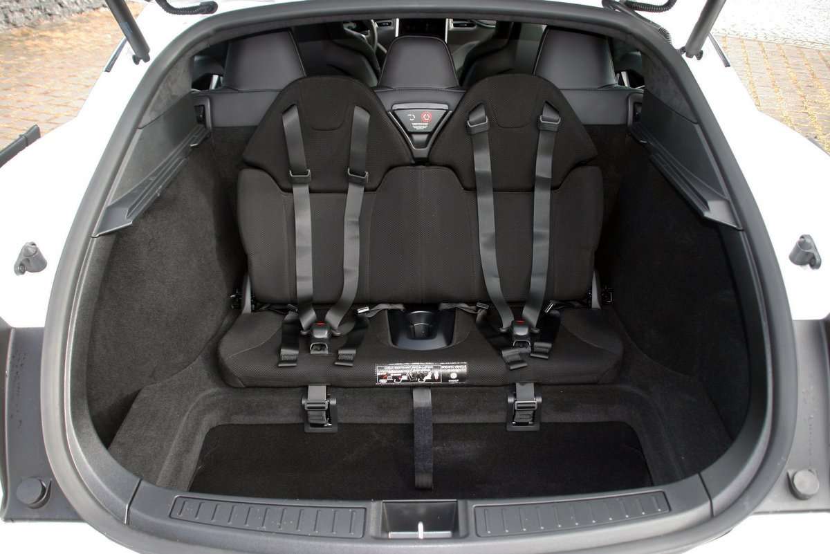 Die Erwartung an einen üppig dimensionierten Raumgleiter stellt das Model S in vollem Umfang zufrieden. Selbst auf den Rücksitzen herrscht vorbildliche Beinfreiheit. Allerdings sind die Sitze sehr tief angebracht, um unter dem flach abfallenden Dach genügend Kopffreiheit zu garantieren. Deshalb müssen die Fondpassagiere einen recht spitzen Kniewinkel hinnehmen. Für sportliche 3.300 Euro kann man das Auto zum Siebensitzer machen. Das aufklappbare Gestühl ist mit wenigen Handgriffen einsatzbereit und Kindern gefällt es, im „Kofferraum“ entgegengesetzt zur Fahrtrichtung unterwegs zu sein. Dass die Polster für Erwachsene nicht taugen, sagt schon die Gewichtsbeschränkung auf 30 Kilogramm. Allen Insassen kommt die serienmäßige Luftfederung zugute, die Bodenfreiheit kann zwischen 120 und 163 Millimetern variiert werden.
