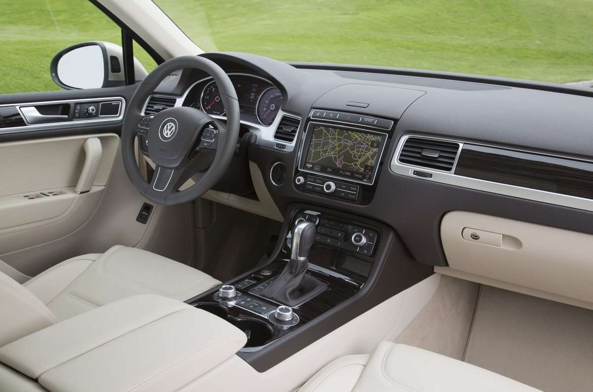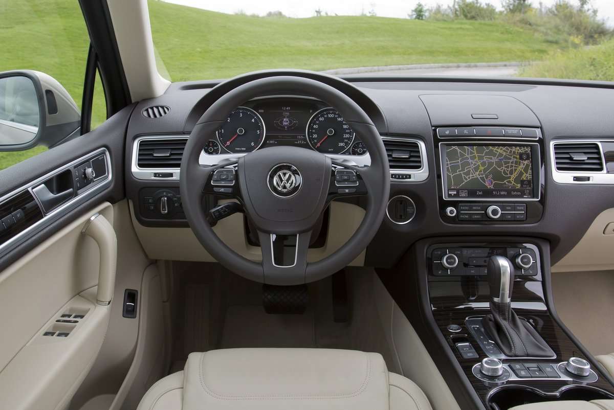 Innenraum: Vor den Komfort haben die Designer aber erst einmal eine Kletterpartie erzwungen. Man sitzt sehr hoch in dem insgesamt 1,71 Meter hohem SUV, dafür aber sehr bequem auf großen Sitzen, mit einer guten Übersicht nach allen Seiten in einem Ambiente, das eher mit Materialien, Verarbeitungsqualität und Übersichtlichkeit glänzt als mit Zierrat. Der Touareg präsentiert sich als das SUV zum Phaeton.