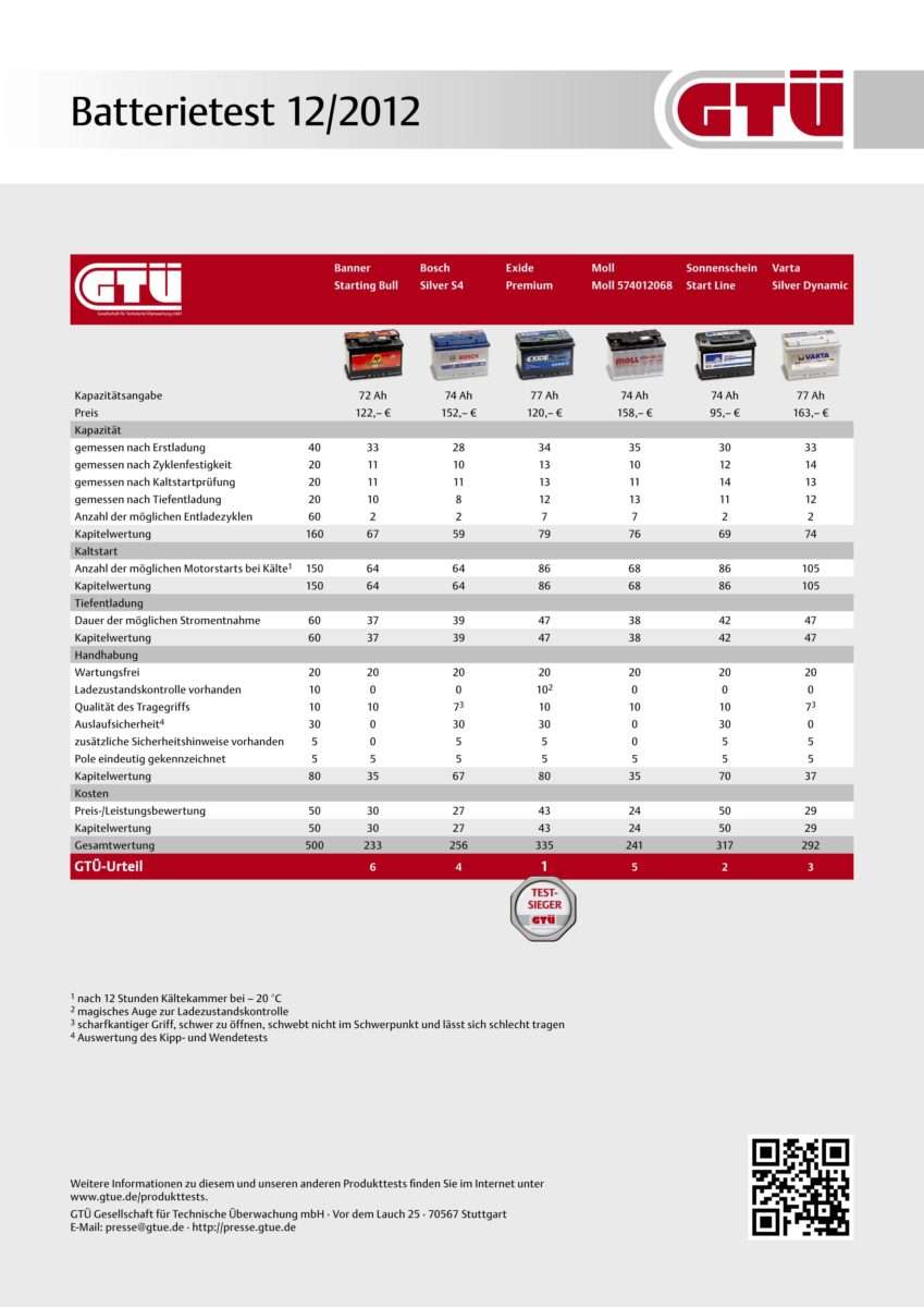 Sieger des GTÜ-Tests ist bei den AGM-Batterien die Banner Running Bull AGM (257 Euro), die beim Kaltstart besonders gut abschnitt (siehe Ergebnistabelle), dicht gefolgt von der zweitplatzierten Varta Start Stop AGM (269 Euro). Den dritten Platz in der Gesamtwertung belegt die Exide Micro-Hybrid AGM (160 Euro). Die Moll AGM 81070 (220 Euro) brilliert auf Platz vier mit großer Ausdauer nach der Tiefentladung.