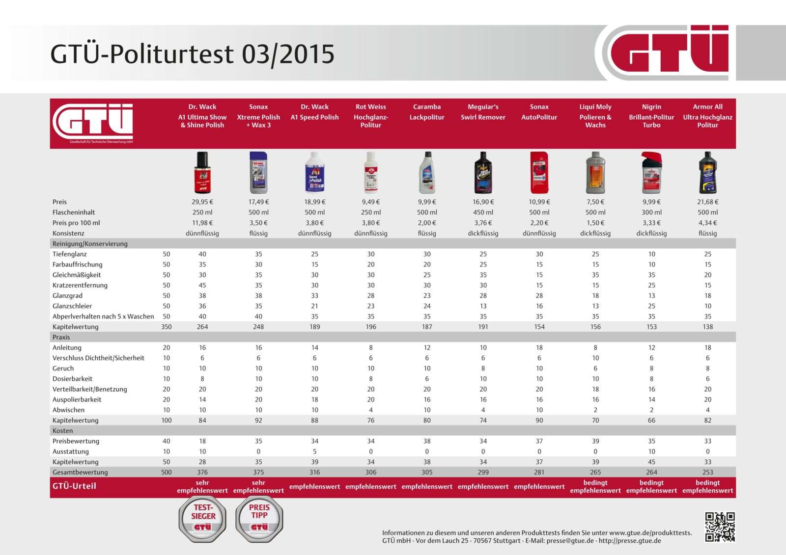 Als „empfehlenswert“ stuften die GTÜ-Prüfer Dr. Wacks preiswerte A1-Politur Speed Polish ein sowie Rot Weiss Hochglanz-Politur, Caramba Lackpolitur, Meguiar’s Swirl Remover und Sonax Autopolitur, die preislich unterhalb der Sonax-Xtreme-Serie rangiert. Als „bedingt empfehlenswert“ erwiesen sich Liqui Moly Polieren & Wachs, Nigrin Brillant-Politur Turbo und Armor All Ultra Hochglanz Politur (siehe Ergebnistabelle).