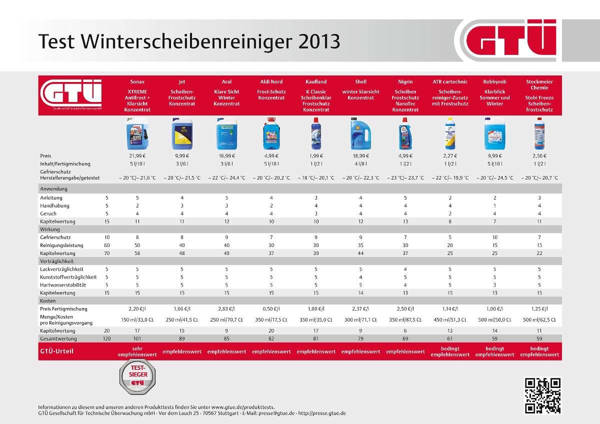 Sieger im großen GTÜ-Vergleich wurde das „sehr empfehlenswerte“ Sonax XTREME Antifrost + Klarsicht Konzentrat (siehe Ergebnistabelle). Gefolgt von sechs Konzentraten mit dem Prädikat „empfehlenswert“: nämlich Jet Scheiben-Frostschutz auf Platz 2, dahinter Aral KlareSicht Winter, Aldi Nord Frost-Schutz, Kaufland K Classic Scheibenklar Frostschutz, Shell Winter Klarsicht und Nigrin Scheiben Frostschutz NanoTec. Des Weiteren die von der GTÜ als bedingt empfehlenswert eingestuften Produkte von ATR cartechnic Scheibenreiniger-Zusatz mit Frostschutz sowie Robbyrob Klarblick und Stockmeier Chemie Stobi Freeze Scheibenfrostschutz.