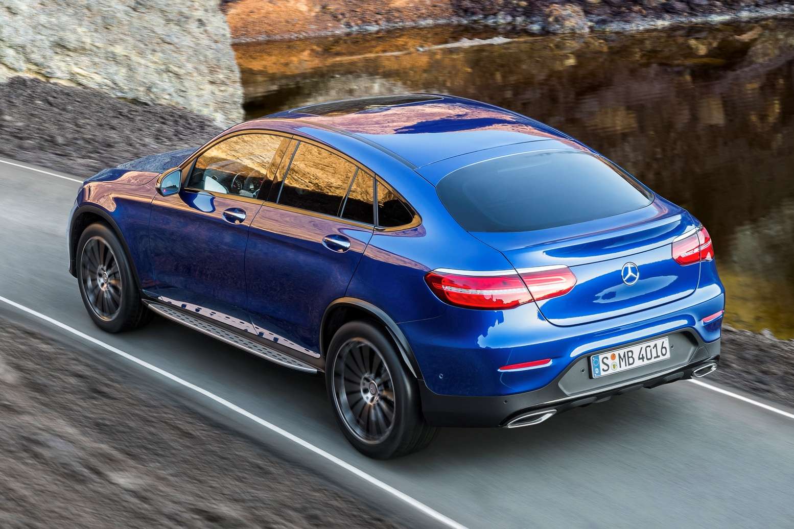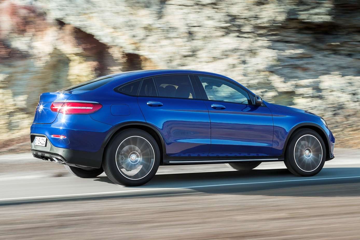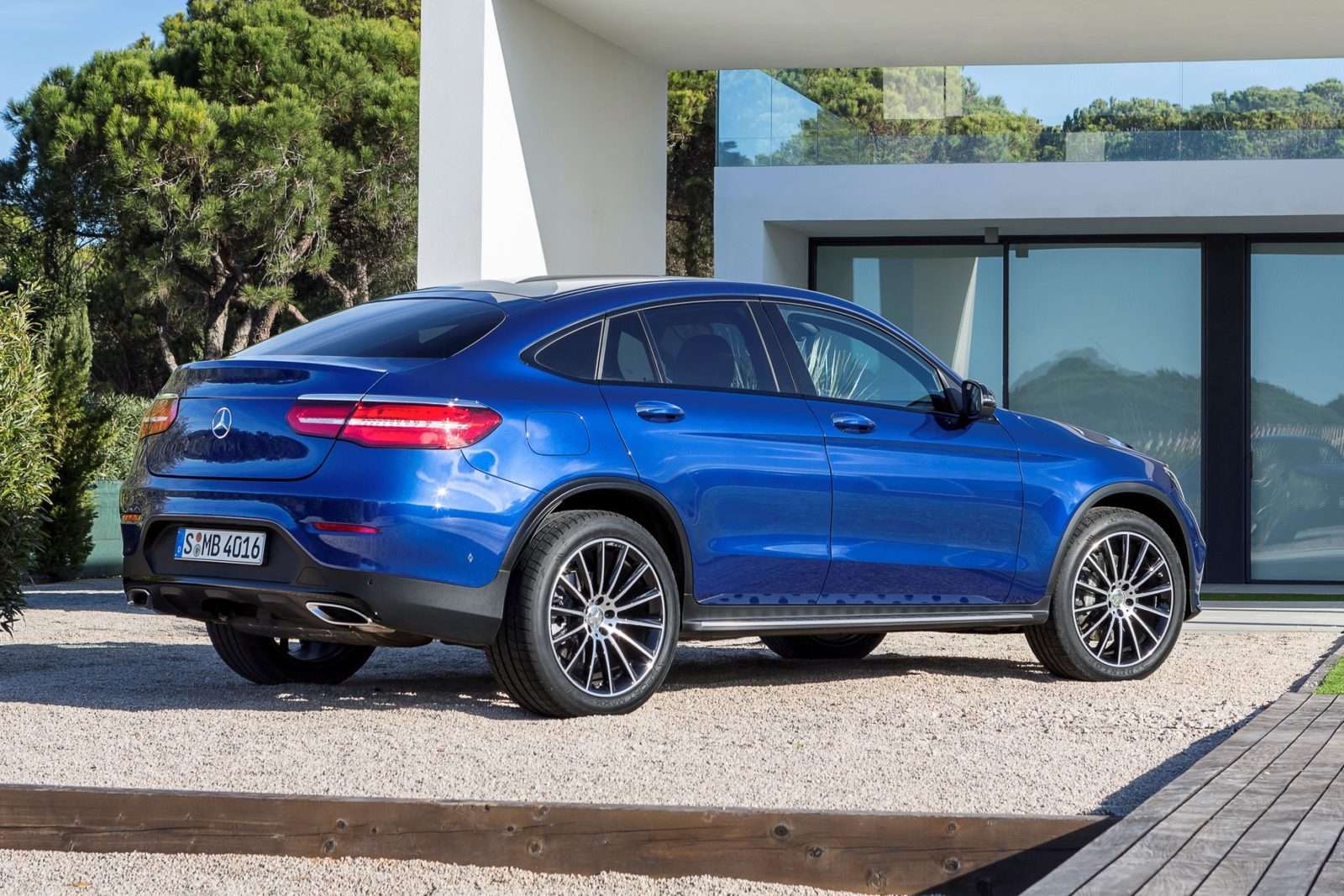 Das GLC Coupé wirkt bei einer Außenlänge von 4,73 Meter, einer Höhe von 1,60 Meter und mit 2,87 Meter Radstand dynamisch-kompakt. Damit ist das Coupé knapp acht Zentimeter länger und rund vier Zentimeter niedriger als der GLC, mit dem es die Grundarchitektur teilt. Seinen eigenständigen Charakter erhält das GLC Coupé durch den Coupé-typischen Diamantgrill mit einer Lamelle und die neugestaltete, abfallende Dachlinie. Schon die A-Säule hat eine flachere Neigung, der weitere Verlauf der Dachsilhouette ist niedriger und fällt nach hinten ab. Die Heckscheibe kommt ohne Wischer aus, weil die Strömung erst hinter der Abrisskante abreißt und somit das aufgewirbelte Schmutzwasser nicht auf die Heckscheibe treffen kann.
