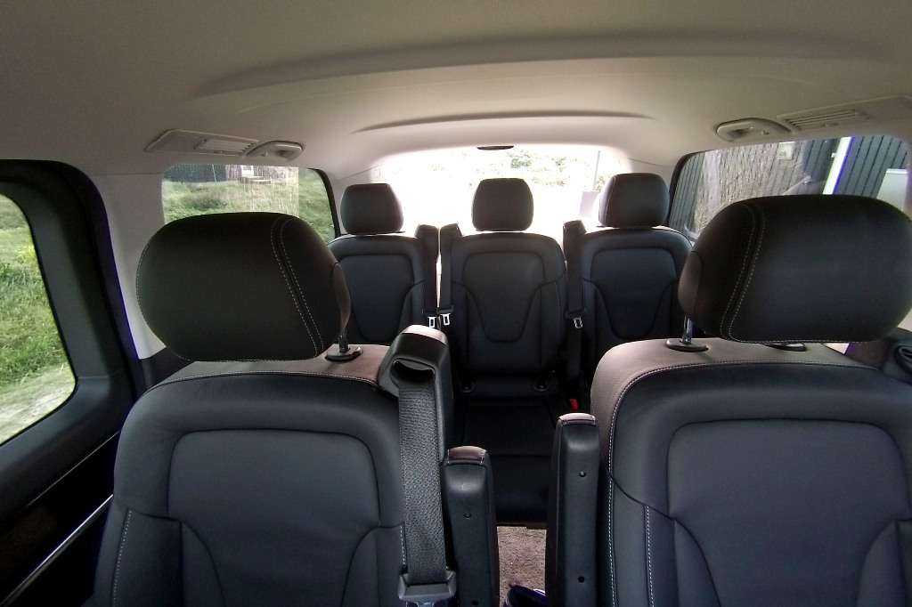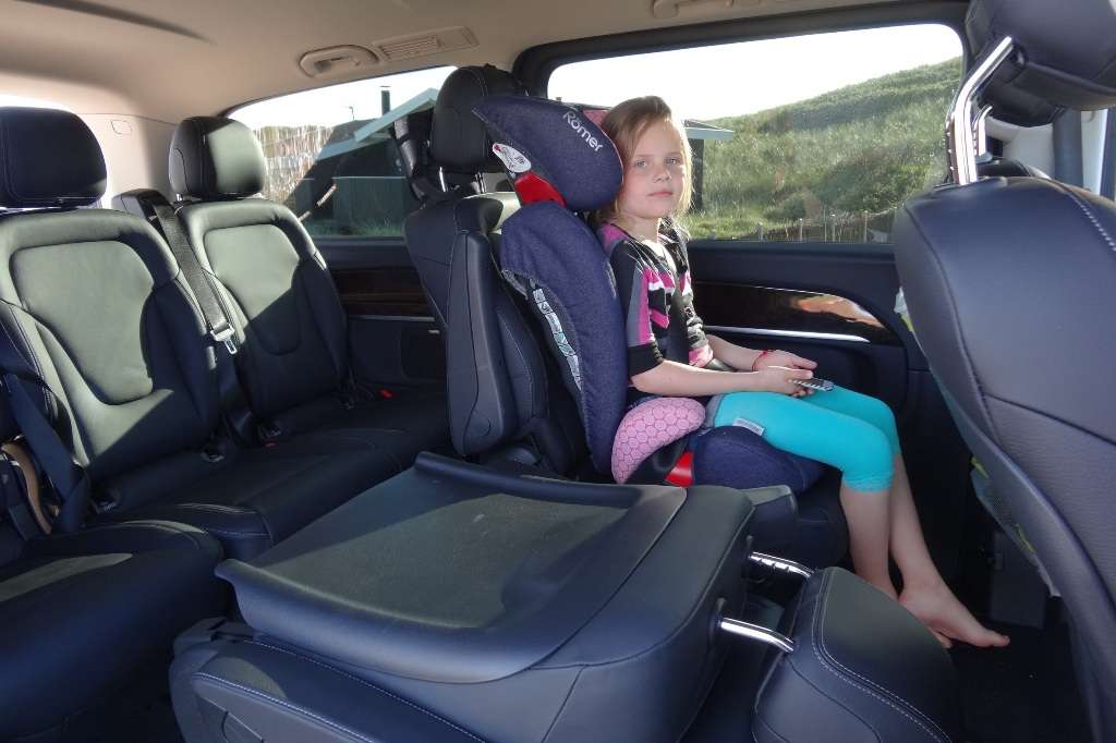 Unsere V-Klasse mit der schwarzen Lederausstattung wirkte eher wie eine edle Limousine für den Transport zum Flughafen oder in andere hochpreisige Gefilde. Doch die fünf vorbildlich untergebrachten Isofix-Befestigungen für Kindersitze sprechen selbst in diesem Edel-Mobil für den Einsatz als Familienfahrzeug. Das verspricht viel Spaß mit fünf maximal Zwölfjährigen auf der Urlaubsreise: Wie lange noch? Mir ist schlecht. Der hat mich getreten. Ich habe Hunger. Ich muss mal. Dafür bleibt an Bord ja immer noch ein vorbildlicher Platz für den Betreuer auf dem Beifahrersitz, im Zweifelsfall mit einem Durchstieg nach hinten. Der ist möglich, weil dem Fronttriebler der Mitteltunnel fehlt.
