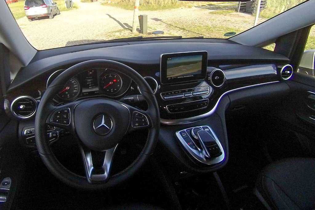 Wir hatten das an Bord und haben es genossen. Mit der Einstellung fürs Fahrwerk und den Antrieb hat der Fahrer ein Instrumentarium in der Hand, mit dem er nicht nur Spielen, sondern auch sparen kann. Im Eco-Modus und mit dem Start-Stopp-System schafften wir die Anreise in den Norden über rund 600 km mit einem Schnitt von 75 km/h und einem Verbrauch von 8,6 Litern Diesel auf 100 km. Das ist ein sehr respektabler Wert für einen fast ausgeladenen Drei-Tonner mit der Stirnfläche der V-Klasse, auch wenn Mercedes-Benz als Durchschnittsverbrauch ab Werk 5,7 Liter auf 100 km angibt. Im Sport-Modus fährt er sich allerdings deutlich agiler, sodass man meint, die V-Klasse schaffe den Sprint von 0 auf 100 km/h schneller als in den angegebenen 11,7 Sekunden.