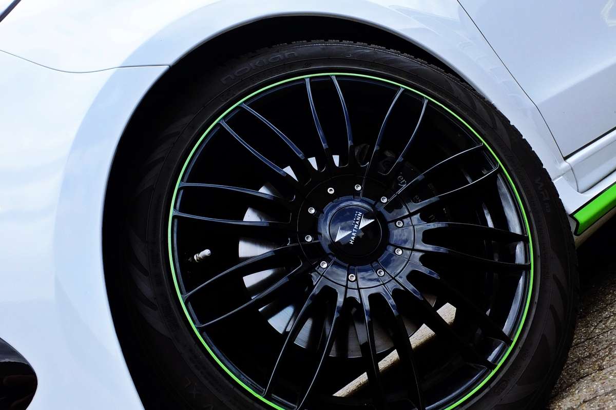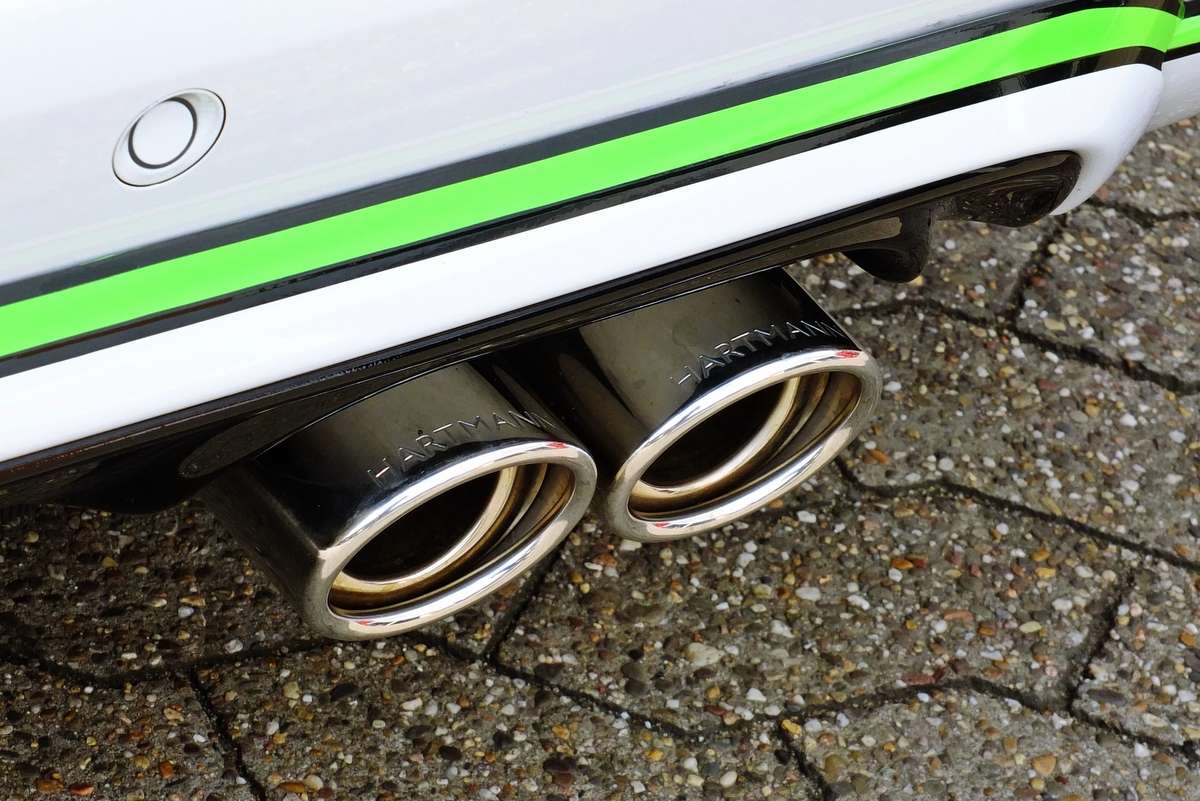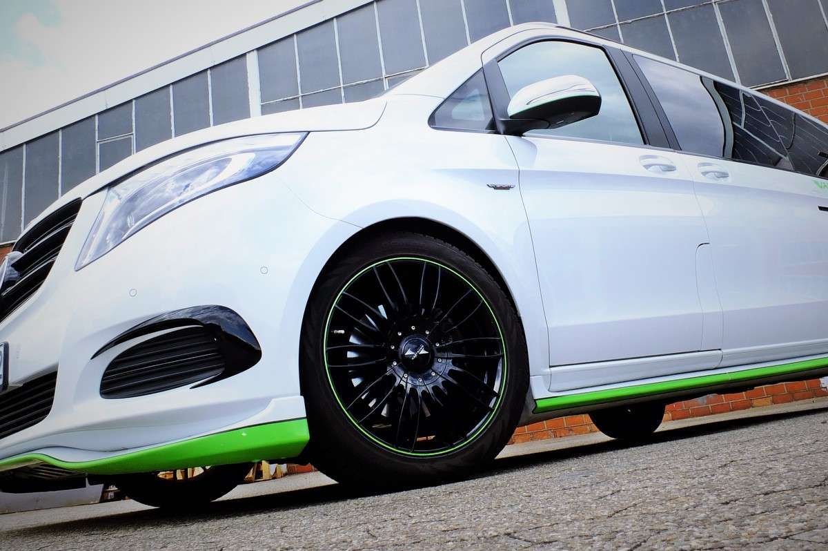 Sehr gut gelungen ist ferner die farbliche Komposition des V250 BlueTEC von Hartmann Tuning. Der farbliche Kontrast von schwarz und weiß sieht ja bekanntlich immer stark und spannend aus. Aber bei dem Referenzfahrzeug wirkt der Effekt noch stärker, weil die grünen Akzente an Designparts und Felgen den HULK im weißen Riesen durchblicken lassen. Und etwas gewaltiger bringt Hartmann Tuning die V-Klasse in der Tat ins Rollen. Auf VEST-1-Felgen in 8,5 x 19, die sich mit 245/45 Pneus sportlich profilieren, geht’s voran – und zwar zügiger dank HARTMANN Power-V25-Chiptuning-Box. Sie hebt die Leistung des 2,1-Liter-Diesel von 190 PS auf 224 Pferdestärken an. Das Drehmoment steigert sich von 440 auf 505 Nm. In allen Phasen der Fahrt kann die V-Klasse von Hartmann Tuning aus den beiden polierten Edelstahl-Endrohren (88 x 74 mm) richtig kraftvoll ausatmen – aber nur, wenn der Fahrer es wirklich krachen lassen will. Denn die satt klingende, knurrig bis bissig abgestimmte Geräuschkulisse wird von einem Hartmann-Soundmodul mit Aktor und CAN-Bus-Anschluss produziert. Auf Knopfdruck wird der Sound-Booster eingeschaltet und das große Motorsport-Sounderlebnis entfesselt – von einem Moment zum anderen ist die Verwandlung vom sanft säuselnde Van zum betörend röhrenden, ungezähmten Biest vollzogen.