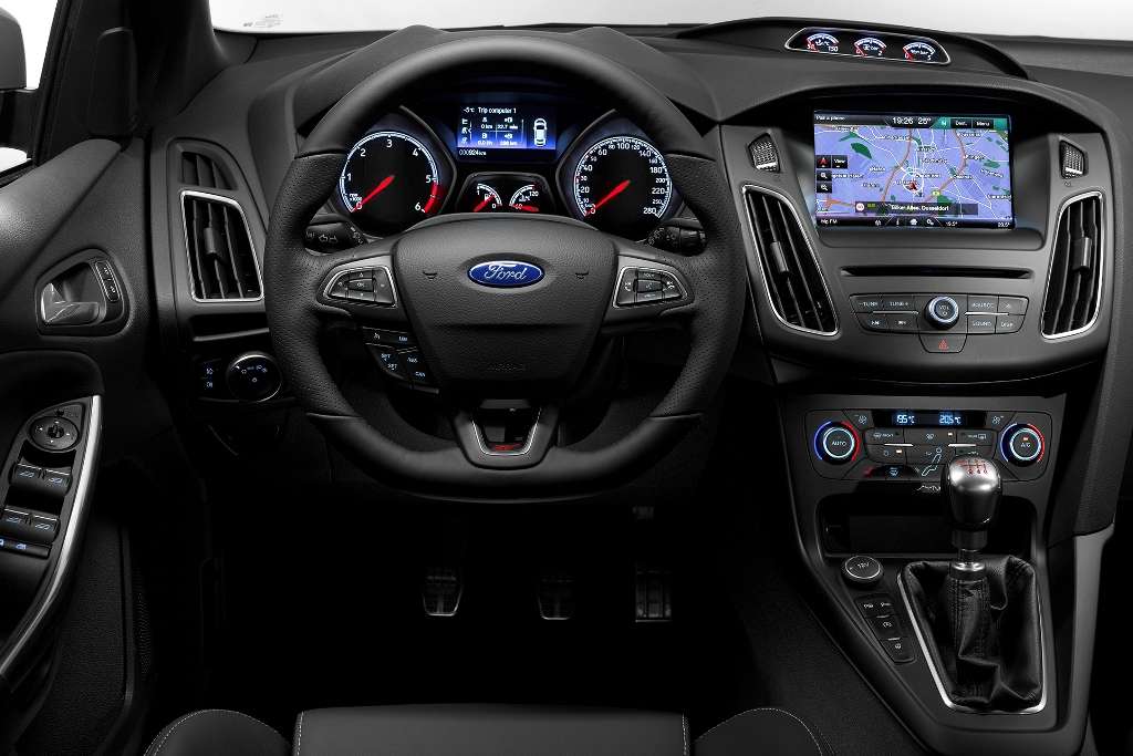 Im Innenraum findet der Fahrer deutlich weniger Schalter und Knöpfe vor als bisher. Nicht nehmen ließen es sich die Ford-Entwickler aber, dem Fahrzeug drei auf dem Armaturenträger platzierte Anzeigen zu spendieren – für Ladedruck, Öltemperatur und Öldruck. Hinzukommen das Sport-Lederlenkrad, der Schaltknauf mit Chrom-Elementen, die „ST“-Pedale, die Türgriffe mit verchromten Zierelementen und beleuchtete Einstiegsleisten aus Aluminium. Für eine angenehme Sitzposition und guten Seitenhalt sorgen die von Ford und Recaro entwickelten ST-Sportsitze.