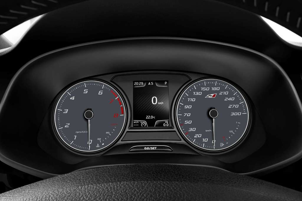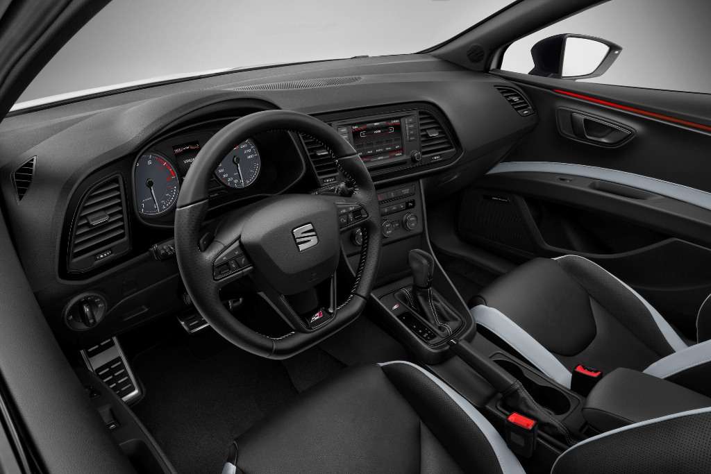 Im Innenraum ist der Cupra-Schriftzug sehr präsent. Das Sportlenkrad mit unten abgeflachten Lenkradkranz ist griffig. In seine Querspeichen sind Multifunktions-Bedienelemente eingelassen. Die Schaltpaddles für das optional erhältliche DSG-Getriebe sind gut erreichbar hinter dem Lenkrad positioniert. Die Sportsitze im dunkelgrauen Alcantara mit weißen Nähten sind dem Sportler vorbehalten. Wahlweise gibt es eine schwarze Vollleder-Ausstattung, ebenfalls weiß vernäht, mit weißen Seitenwangen und einem weißen Einsatz in der Türverkleidung.