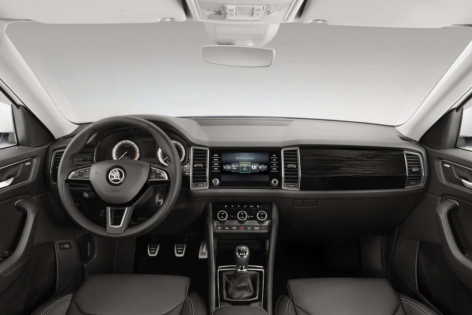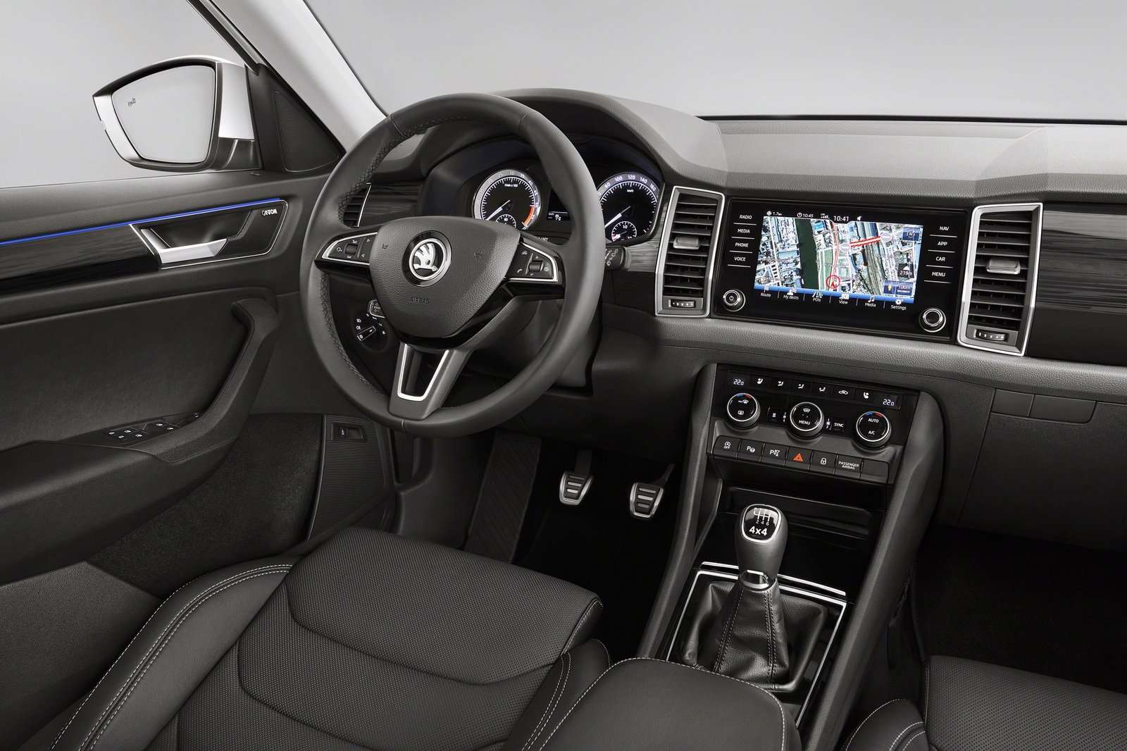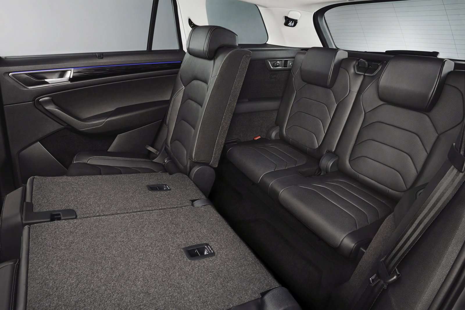 Wie das Exterieur wirkt auch das Interieur beschützend und robust. Starke vertikale Elemente wie die vier großen Luftdüsen sind für den Innenraum charakteristisch. Das große Display teilt die Instrumententafel in zwei gleichwertige Zonen für Fahrer und Beifahrer. Für die vorderen Sitze sind zahlreiche Komfortausstattungen erhältlich. Sie sind wahlweise beheizbar, belüftbar und elektrisch einstellbar inklusive einer Memory-Funktion. Die Rücksitzbank des Kodiaq lässt sich im Verhältnis 60:40 umklappen, um 18 cm längs verschieben und in der Lehnenneigung verstellen. Auf Wunsch gibt es zwei weitere Sitze in der dritten Reihe. Damit ist der Kodiaq ist der erste Siebensitzer von Skoda.