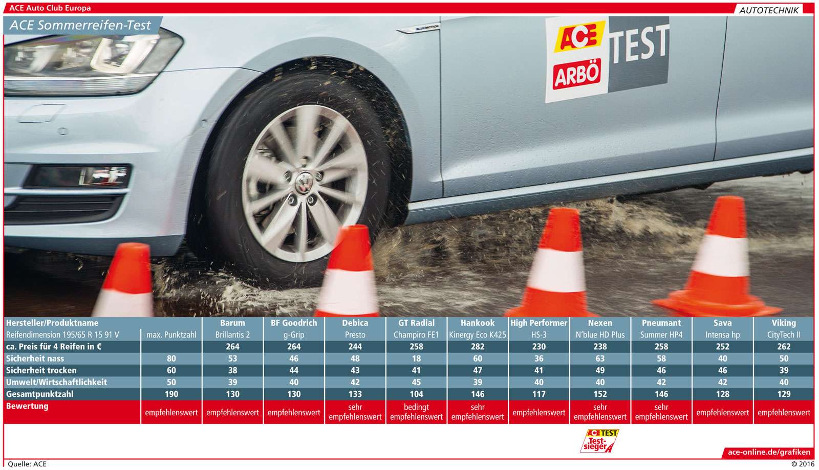 Testsieger beim ACE-Sommerreifentest 2016 wurde der Nexen N’Blue HD Plus (152 von 190 Punkten) vor dem Hankook Kinergy Eco K425 und dem Pneumant Summer HP4, die beide gleichauf liegen (146 Punkte). Alle drei Modelle überzeugten sowohl auf trockener als auch auf nasser Fahrbahn – eine Aufgabe, die jeder gute Sommerreifen leisten muss. Doch andere Reifen zeigten genau hier Schwächen: Der Sava Intensa hp, auf trockener Fahrbahn auf Platz drei, fällt auf Nässe deutlich ab und landet durch die schlechten Brems- und Handlingswerte auf nasser Fahrbahn nur auf dem achten Platz. Bedenklich schlechte Werte erzielte auf Nässe jedoch der GT Radial Champiro FE1 – er kam beim Bremsen von Tempo 100 erst nach 61,7 Metern zum Stehen – 15,4 Meter hinter dem Testsieger Nexen (46,3 Meter). Mit anderen Worten: Wo das Testfahrzeug mit Nexen-Bereifung schon steht, kracht der Wagen mit GT-Radial-Reifen mit etwa Tempo 50 ins Stauende.