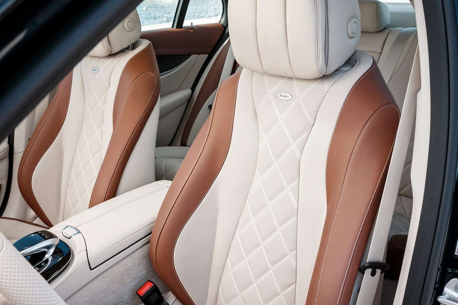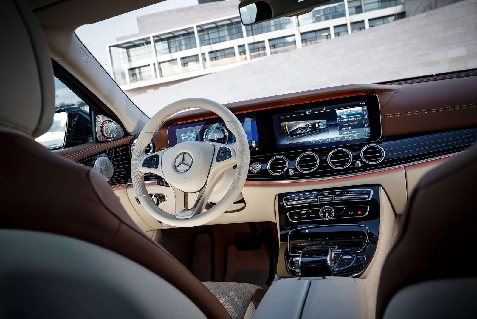 Im Innenraum vereinen die Sitze Langstreckentauglichkeit und sportliche Optik. Die Fondsitzbank kann auf Wunsch mit einer dreiteiligen Rückenlehne (40:20:40) geliefert werden. Ebenfalls gegen Aufpreis zieht ein virtuelles Cockpit mit zwei Displays mit jeweils 12,3 Zoll Bilddiagonale in den Armaturenträger ein und gibt der E-Klasse den futuristischen Anstrich, den die klassischen Rundinstrumente der Basisversion nicht zu vermitteln mögen. Optisch verschmelzen die beiden Displays unter einem gemeinsamen Deckglas und einer gemeinsamen Hutze zu einem Cockpit. Für das Design der Anzeigen kann der Fahrer aus drei verschiedenen Grafikrichtungen wählen.