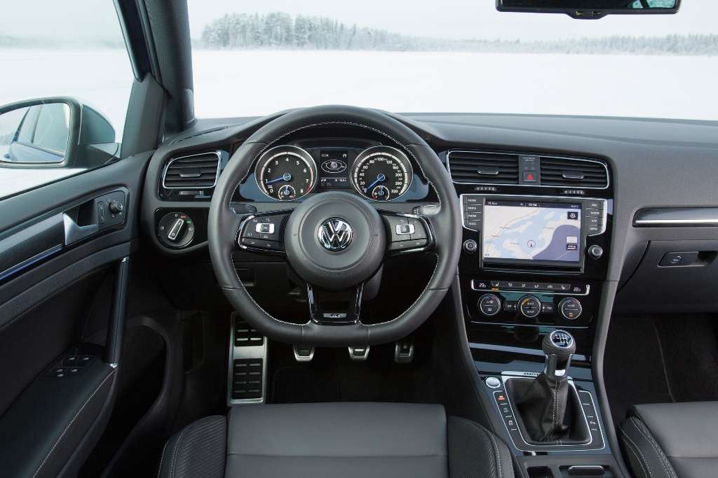 Der neue Golf R ist außerdem serienmäßig mit der Funktion „ESC Sport“ ausgestattet. Aktiviert wird das System über einen zweistufigen Schalter auf der Mittelkonsole. Drückt der Fahrer die Taste ein-mal kurz, schaltet die Electronic Stability Control (ESC) in den Modus „ESC Sport“. Bei sehr schnellen und kurvenreichen Fahrten spricht das ESC später an. Das war unsere Lieblingsstellung auf dem Eis. Mit einem längeren Druck auf die Taste das ESP ganz auszuschalten, verlangt den kompletten Profi am Steuer.